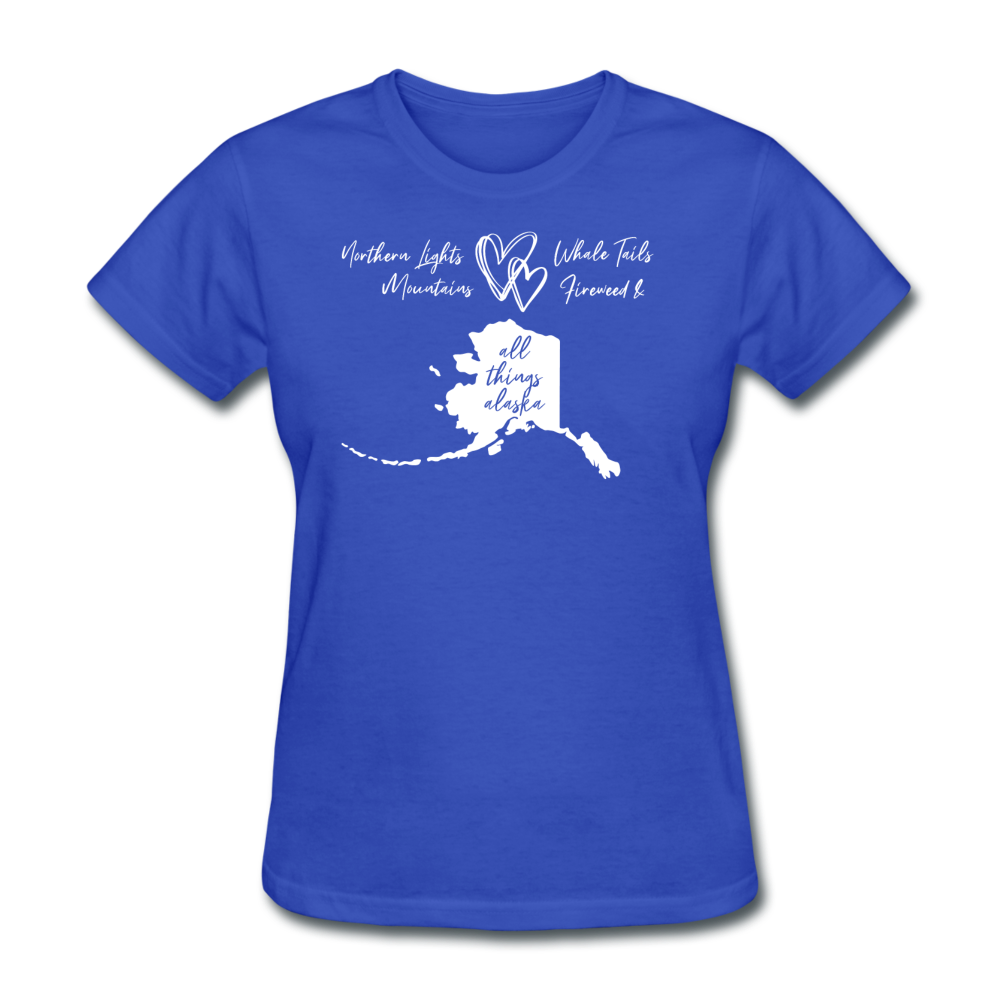 The hardest part about this design was shortening the huge list of things we LOVE about Alaska! Northern Lights, Whale Tails, Mountains, Fireweed & All Things Alaska was about the best way we could sum it up! Available in several colors, this shirt is printed on demand in the lower 48 and sent directly to your door! Also available as a warm unisex hoodie here!
